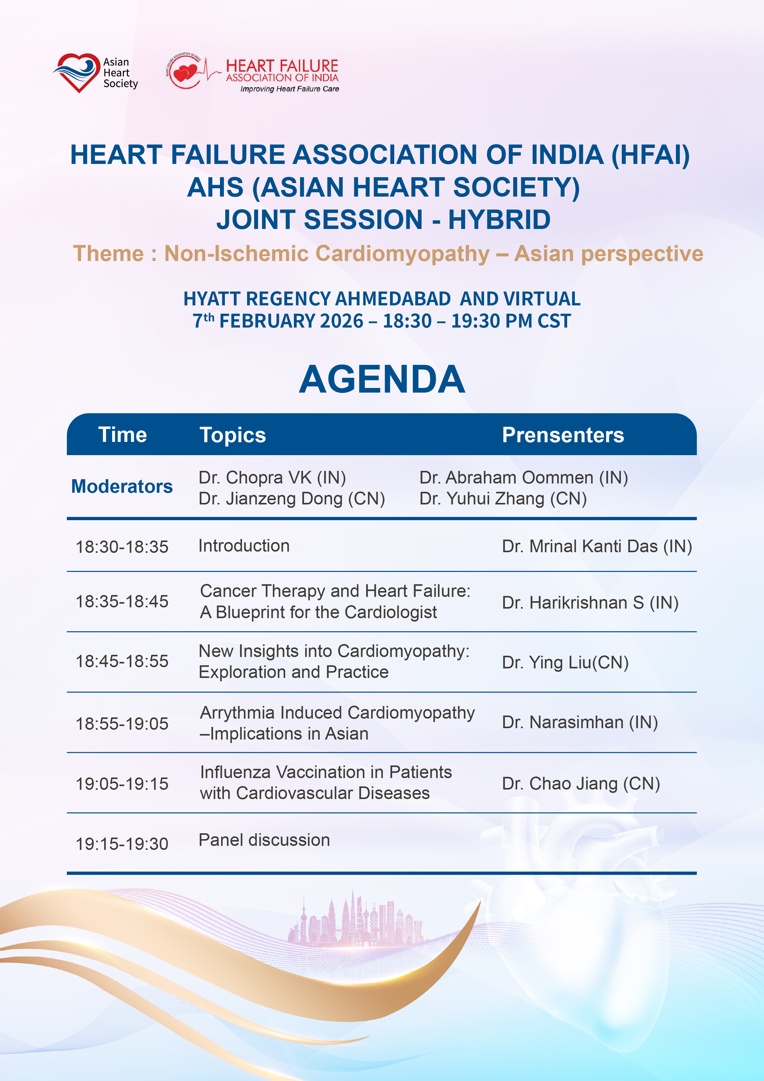 A joint session of the Heart Failure Association of India (HFAI) and the Asian Heart Society (AHS) will be held on February 7, 2026, from 18:30 to 19:30 CST in a hybrid format at the Hyatt Regency Ahmedabad and online. Centered on the theme "Non-Ischemic Cardiomyopathy - Asian Perspective," the session will be co-moderated by Dr. Chopra VK and Dr. Abraham Oommen from India, together with Dr. Jianzeng Dong and Dr. Yuhui Zhang from China.